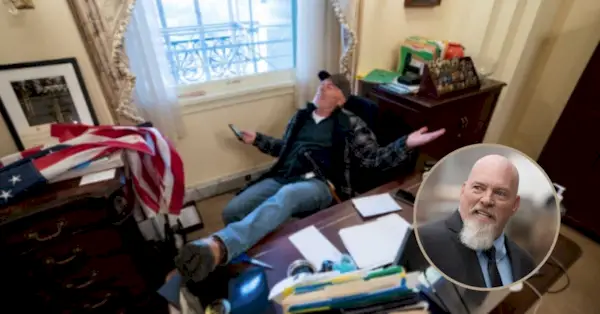Ричарда «Биго» Барнетта можно увидеть в кабинете тогдашнего спикера Палаты представителей Нэнси Пелоси (демократ от Калифорнии) во время беспорядков в Капитолии США 6 января 2021 года (согласно материалам суда Министерства юстиции). На врезке: Ричард Барнетт, житель Арканзаса, которого сфотографировали, положив ноги на стол в офисе спикера Палаты представителей Нэнси Пелоси во время беспорядков в Капитолии США 6 января, прибывает в федеральный суд в Вашингтоне во вторник, 10 января 2023 г. (AP Photo/Manuel Balce Ceneta).