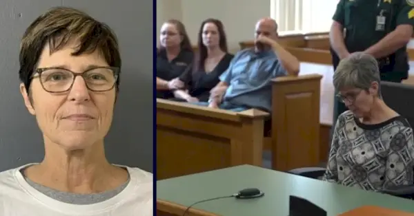 Фотография бронирования Трейси Никс (через офис шерифа округа Харди); Никс в суде, за ней наблюдают дочь Кайла Шок-Никс и муж Дрю Шок (через YouTube/WTVT Fox13 Tampa Bay)